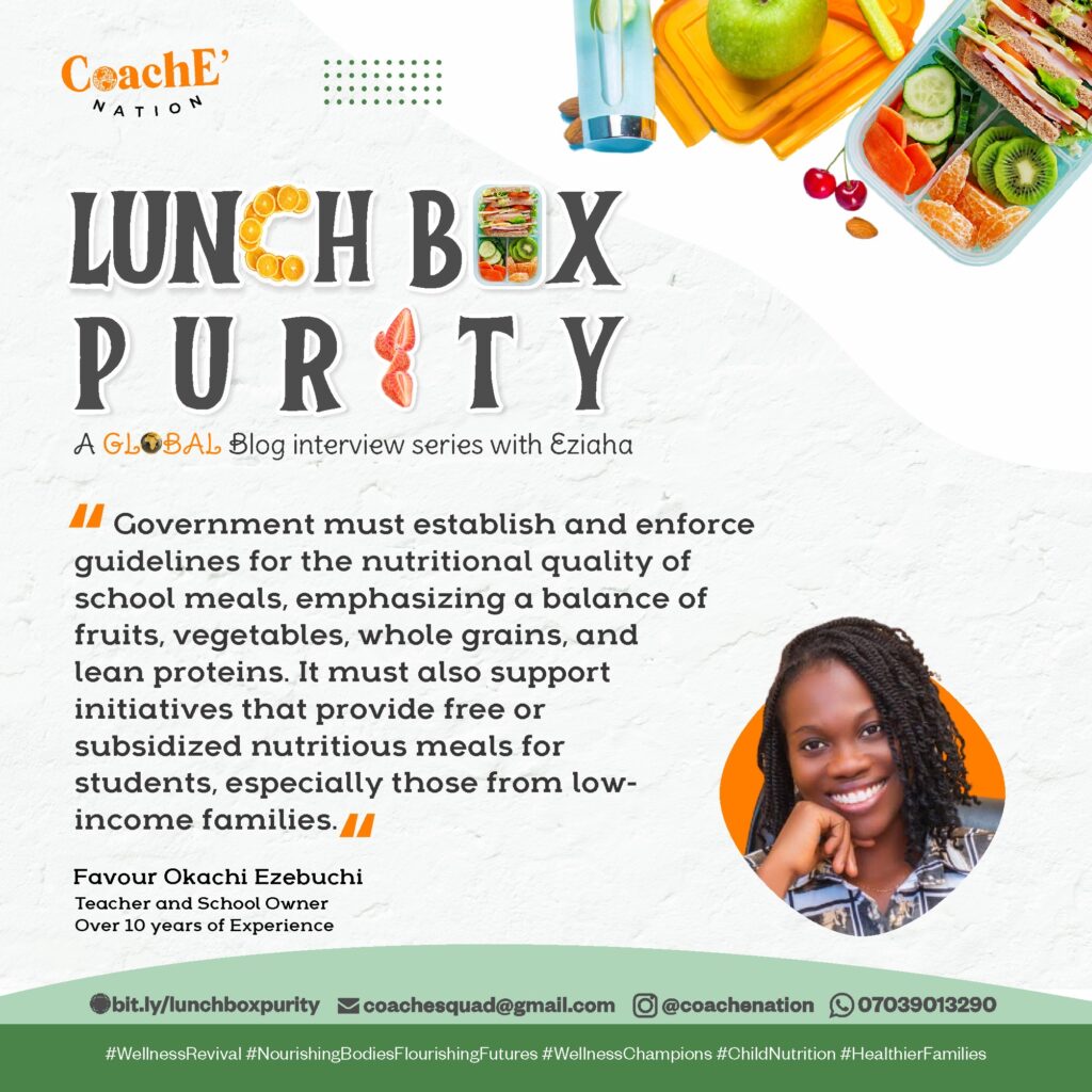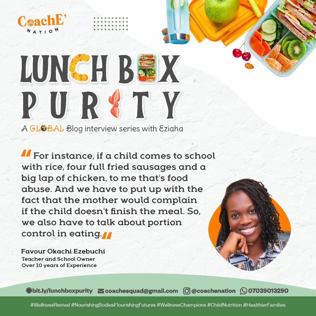 For instance, if a child comes to school with rice, 4 full fried sausage and a big lap of chicken, to me it’s food abuse. And we have to put up with the fact that the mother would complain if the child doesn’t finish the meal. So we have to talk about portion control in eating. – Favour Okachi Ezebuchi